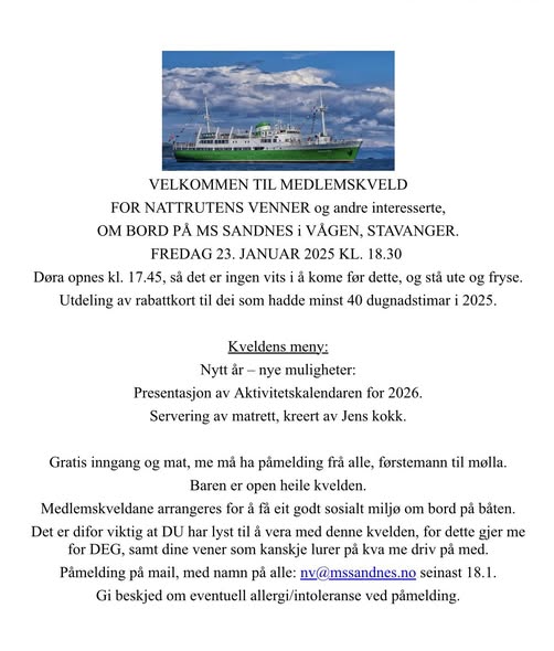Årets første Medlemskveld i MS Sandnes si venneforening, Nattrutens Venner.